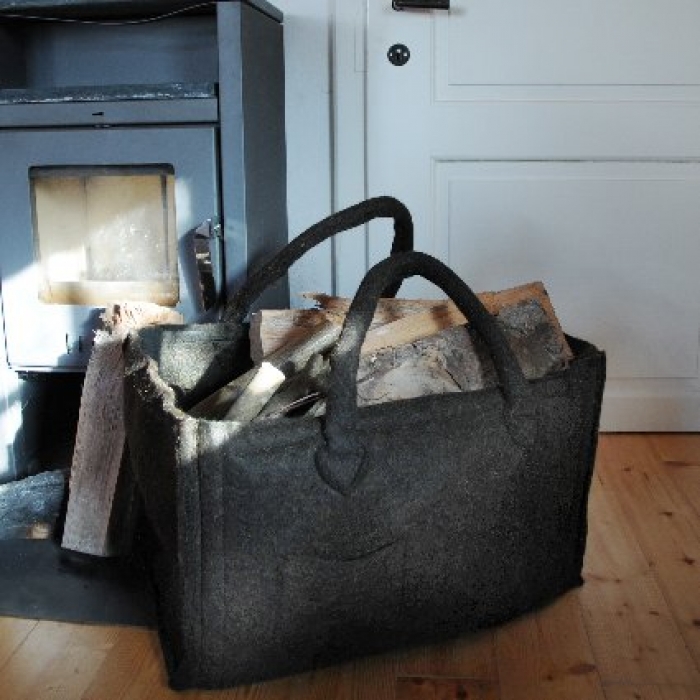 Eine besondere Holztasche für die dekorative Kaminholzaufbewahrung aus dickem, grauschwarz meliertem Wollfilz. Der flauschige Charakter ist ein reizvoller Kontrast zu den Holzscheiten und ergänzt unterschiedliche Wohnstile. Dicke, angenehme Tragegriffe.