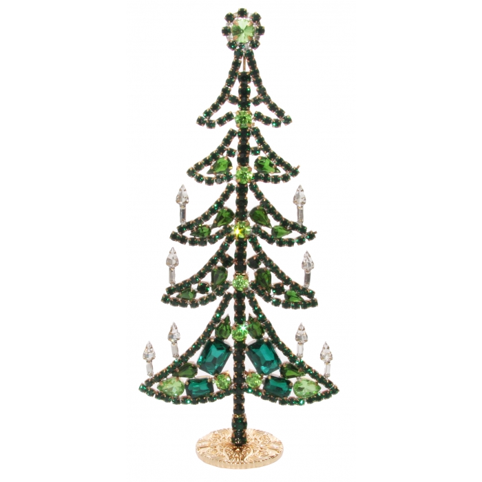In der Tradition hochwertiger Glasmacherkunst wird auch dieser Gablonzer Retro-Schmuckbaum in Handarbeit gefertigt. Die funkelnden, facettierten Glassteine in Grüntönen sind einzeln gefasst, auf der Rückseite ist die Montur komplett messingfarben.