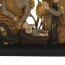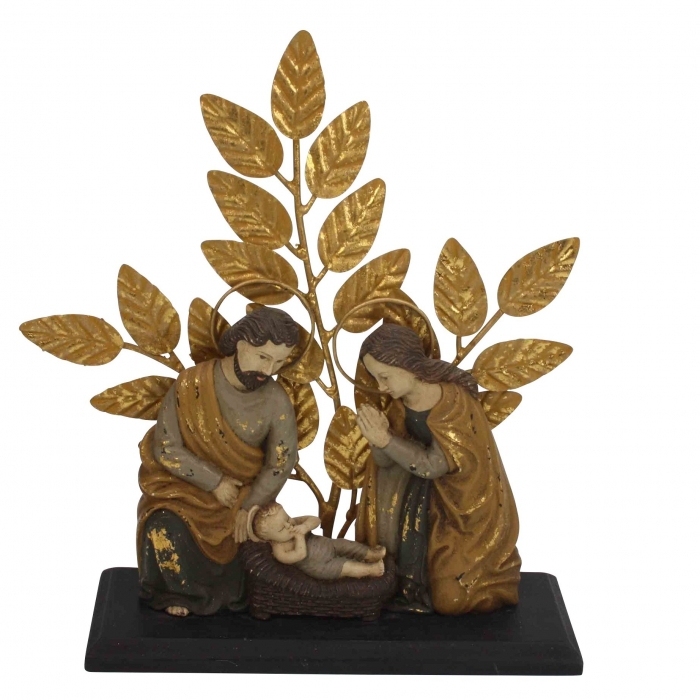 Kleine Weihnachtskrippe mit goldfarben patinierten Olivenzweigen, ein schönes Symbol für die Botschaft der Heiligen Nacht.
