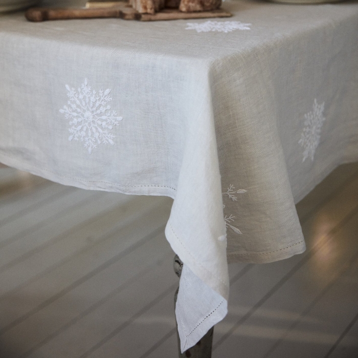 Feiner Leinenstoff mit dezenter Struktur der Flachspflanze, das weiße, gestickte Ornament harmoniert mit dem hellbeigen Naturton. Immer schön in Kombination mit natürlicher Tischdekoration, ein gekonnter Stilbruch zu elegantem Geschirr aber auch die ideale Tischwäsche für den pure & slow Stil.