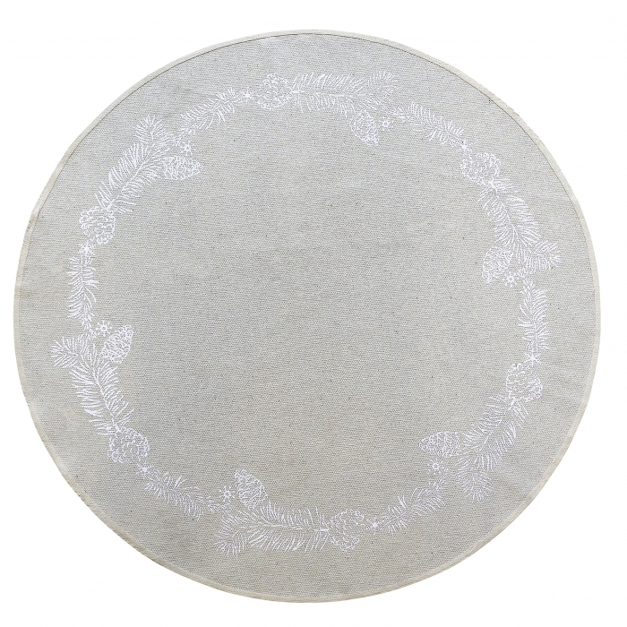 Gewebter, heller Baumwolle Teppich mit schlichter, weißer Tannenzweig & Zapfen Bordüre und Randeinfassung.