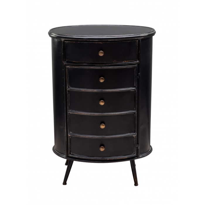 Art Déco Style – ovale Kommode aus patiniertem Eisen mit dezenter Patinierung im Antikstyle. Oben eine Schublade, die unteren 4 Schubladen sind optisch dekorativ, tatsächlich aber eine Türe.