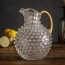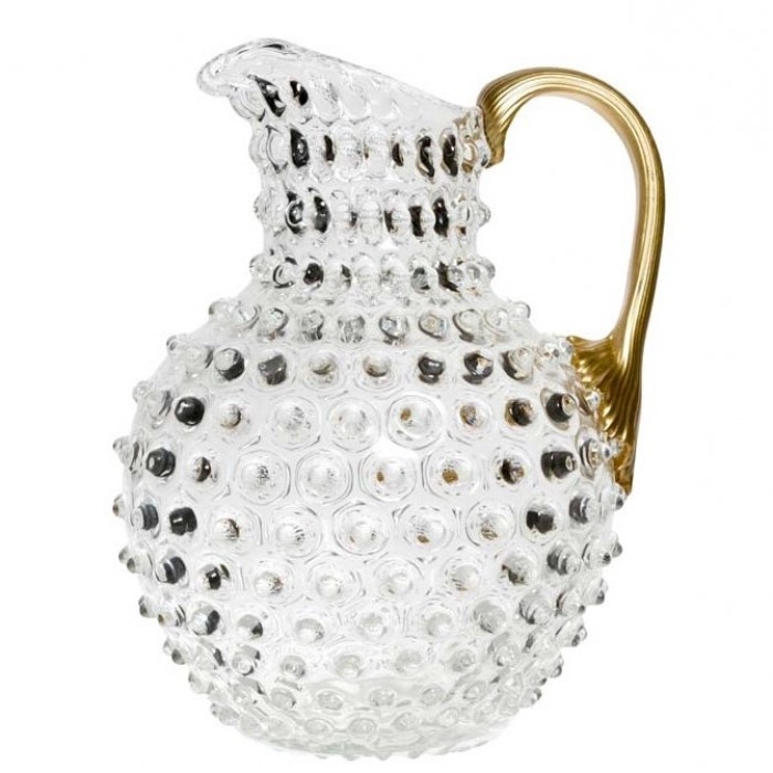 Mundgeblasener Wasserkrug und dekorative Vase aus bleifreiem Kristallglas. Das Hobnail- bzw. Tautropfen Design reflektiert Licht glanzvoll und unterstreicht die Eleganz von klarem Glas. Der leicht gerillte, goldfarbene Griff ist handlich und wird dem Füllvolumen gerecht.