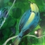 Eine faszinierende Farbkomposition aus nuancierten Blau- und Grüntönen, kombiniert mit leuchtendem Gelb, das stilisierte Vogel-Motiv erscheint fast transparent.