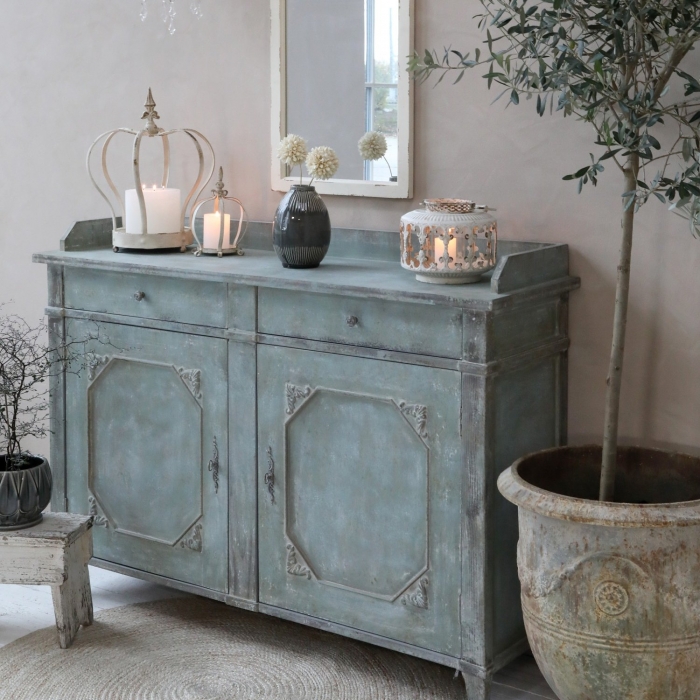 Schranktisch mit 2 Türen und 2 Schubladen in einer wunderschönen Antik Patinierung in opal. Auch erhältlich in antique-cream.