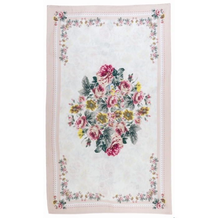 Bezaubernder Veloursteppich, bedruckt mit Rosenblütenranken in eleganten Pastelltönen, hergestellt in Italien. Der feine, leichte Teppich hat auf der Rückseite eine
