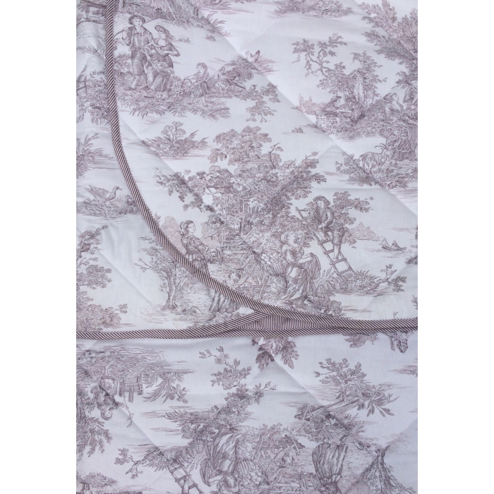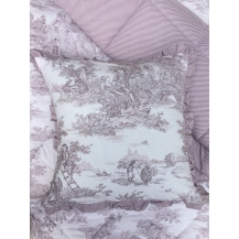 Zauberhaftes Toile de Jouy Muster mit ländlichen Szenerien. Das Muster ist in einem llila/taupe Farbton auf weißem Untergrund, die Rückseite und die Paspelierung an den Rändern (an den Ecken abgerundet) ist in einem feinen lila/taupe und weißen Streifen.