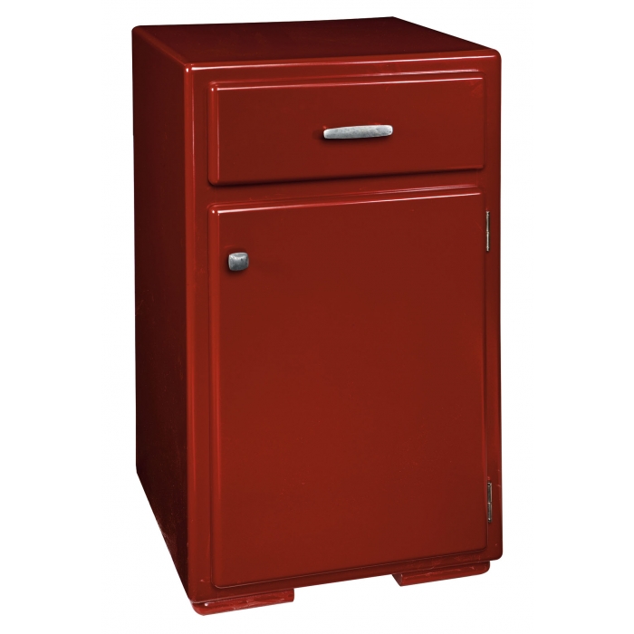 Chilli-red lackierter Holzschrank mit Schublade und 2 Fächern in Schreinerqualität.