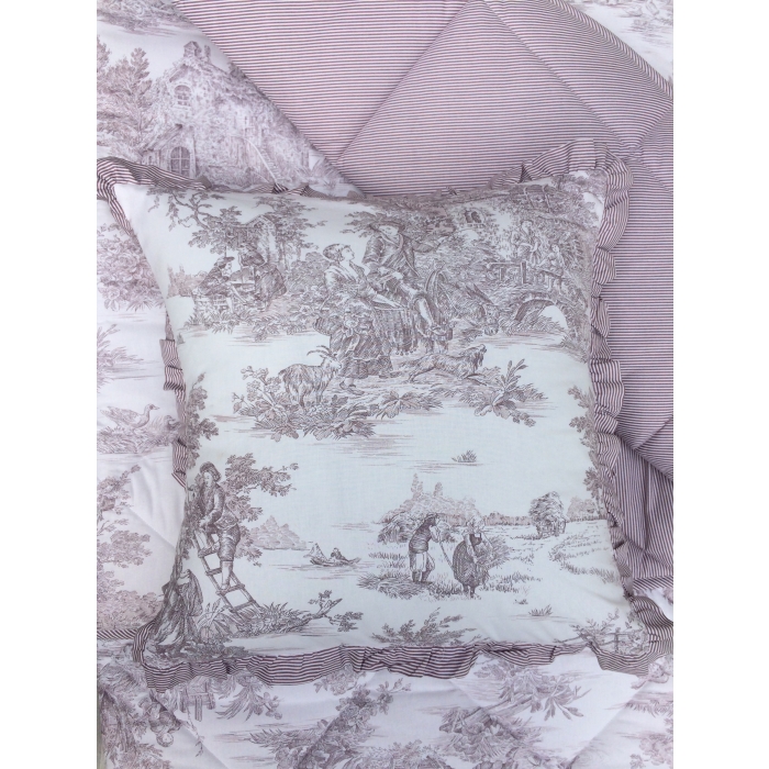 Zauberhaftes Toile de Jouy Muster mit ländlichen Szenerien. Das Muster ist in einem lila/taupe Farbton auf weißem Untergrund, die Rückseite und der Rand aus Rüschen ist in einem feinen lila/taupe und weißen Streifen.